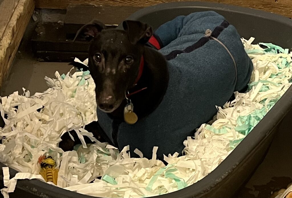 The boy is a real gem, he enjoys his time outside – sniffing, more sniffing and his human cuddles but when he has finished he is quite happy to take himself back to bed, waiting for his human friend to bring him his treat!