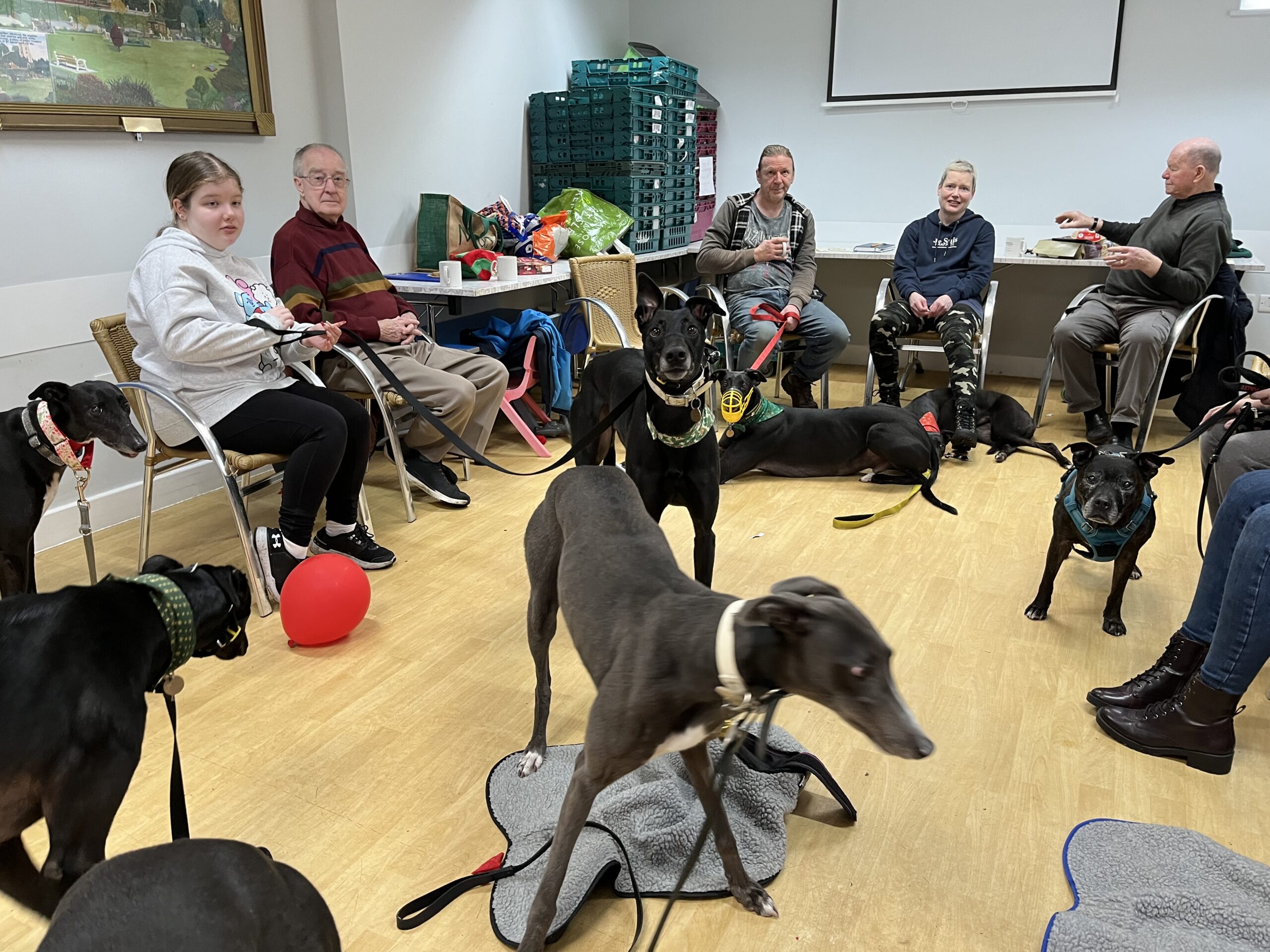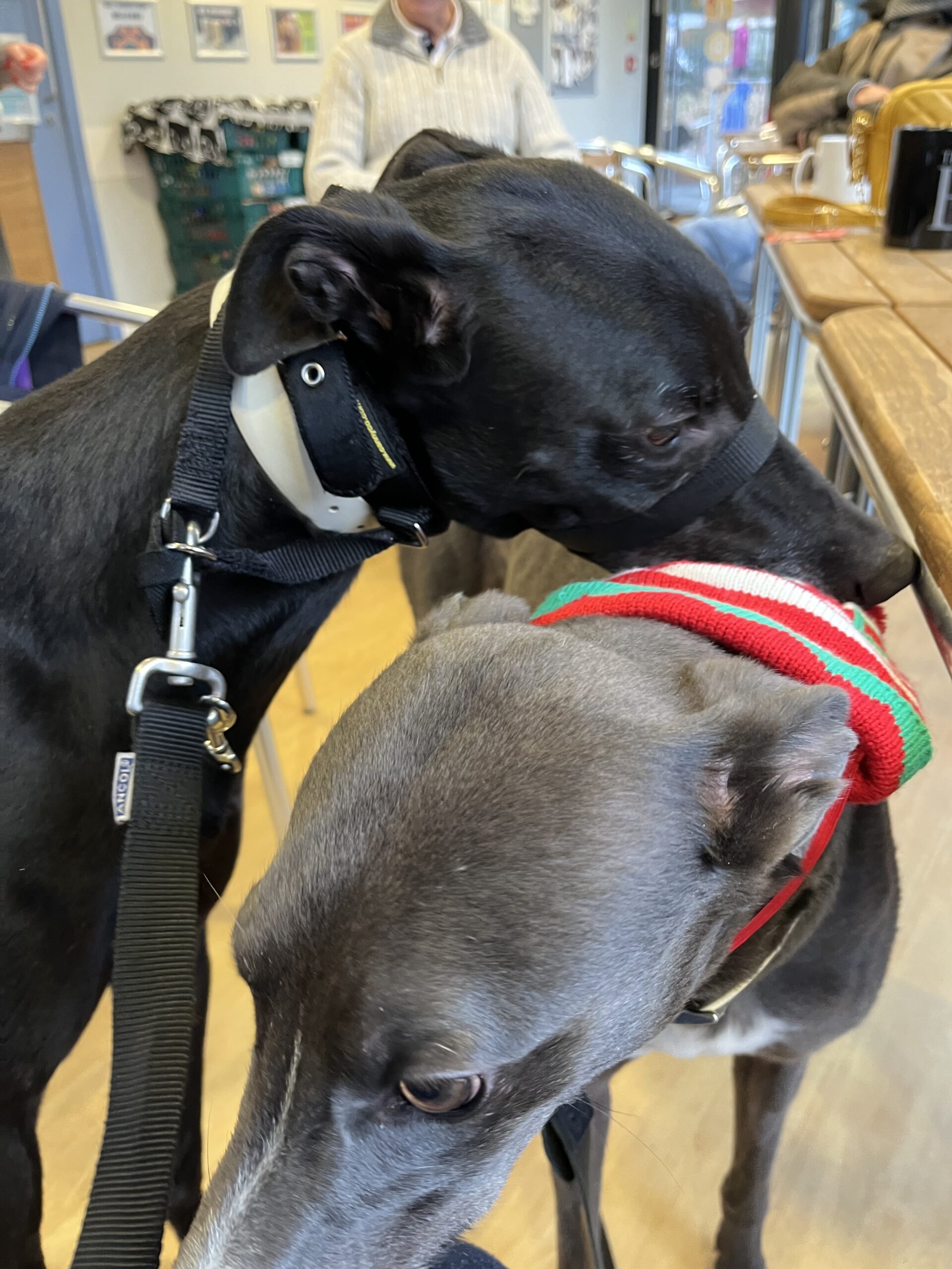 Fury has met a variety of other breeds on walks and up close. At our Christmas Café Session – Fury was making friends with a Staffie that came to join us.