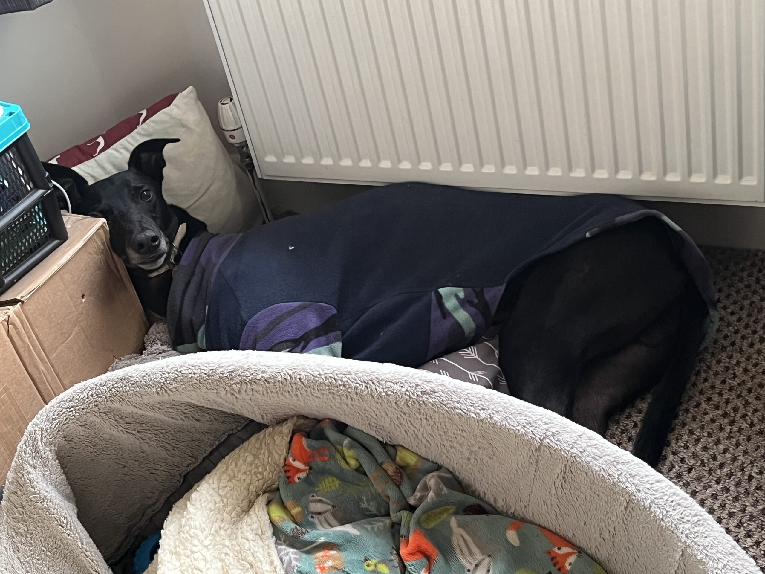 Fury is fine to be left in the house for a few hours, he can be left on his own or with his greyhound friends. This lad is also crate trained but is equally happy to be left out with a nice comfy bed.