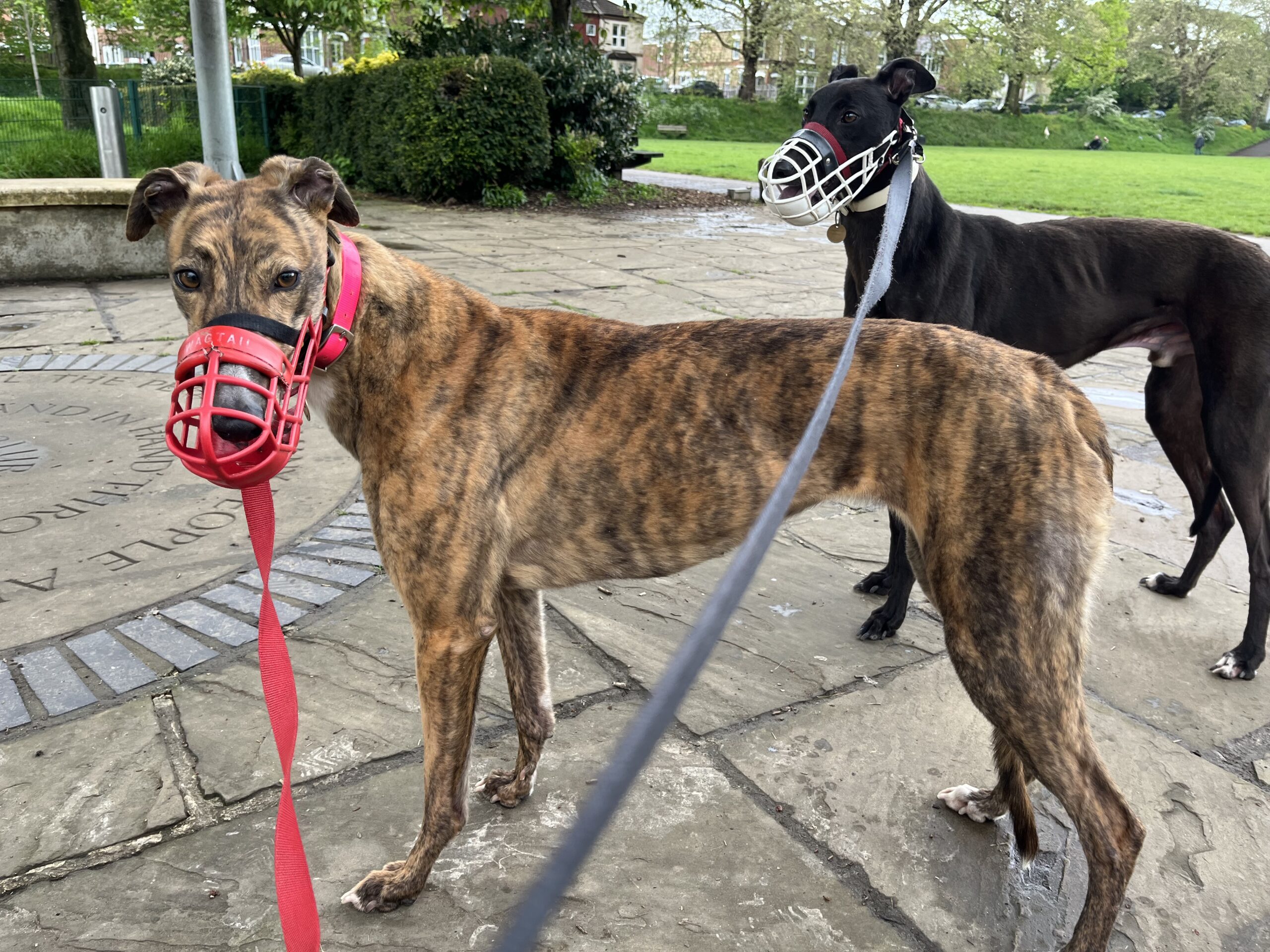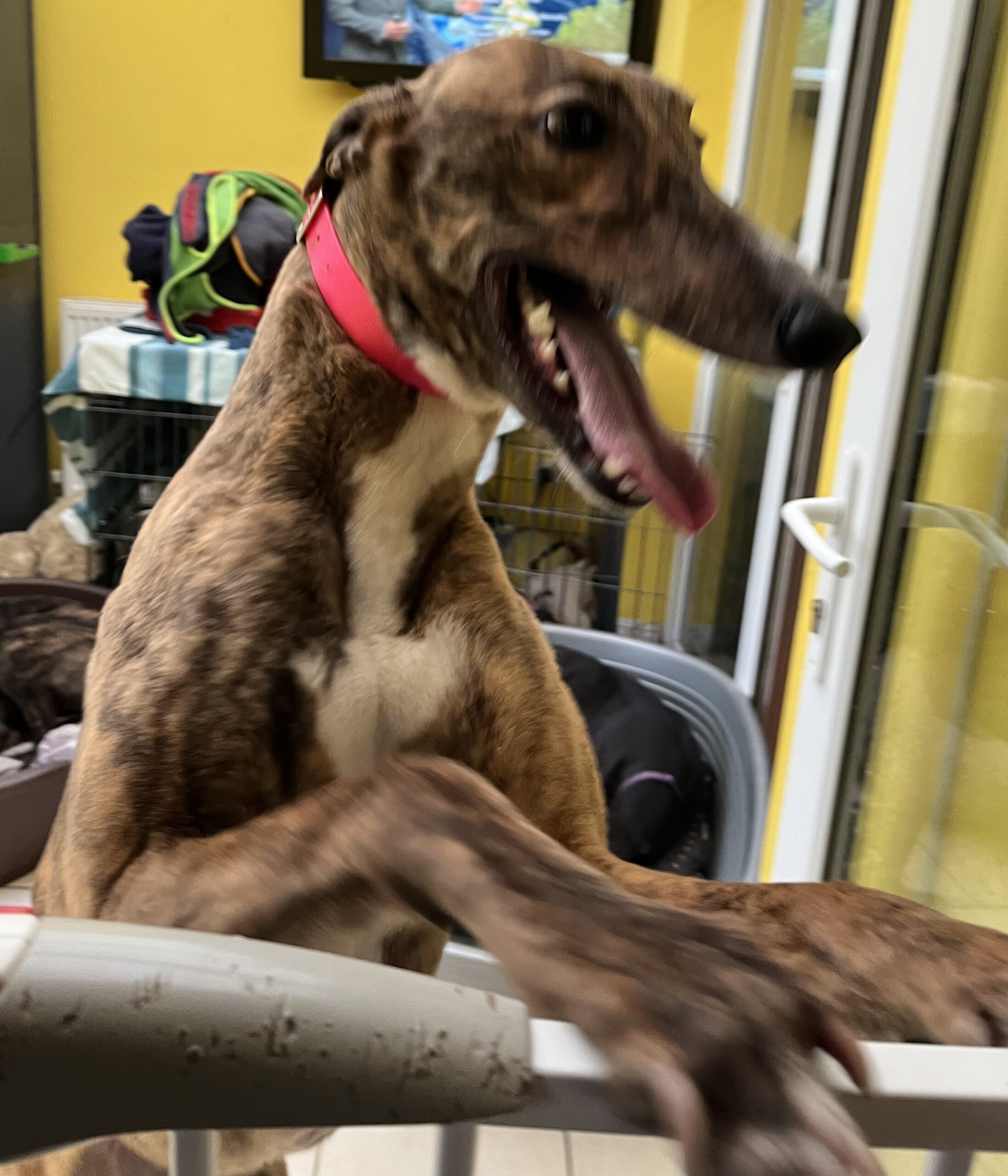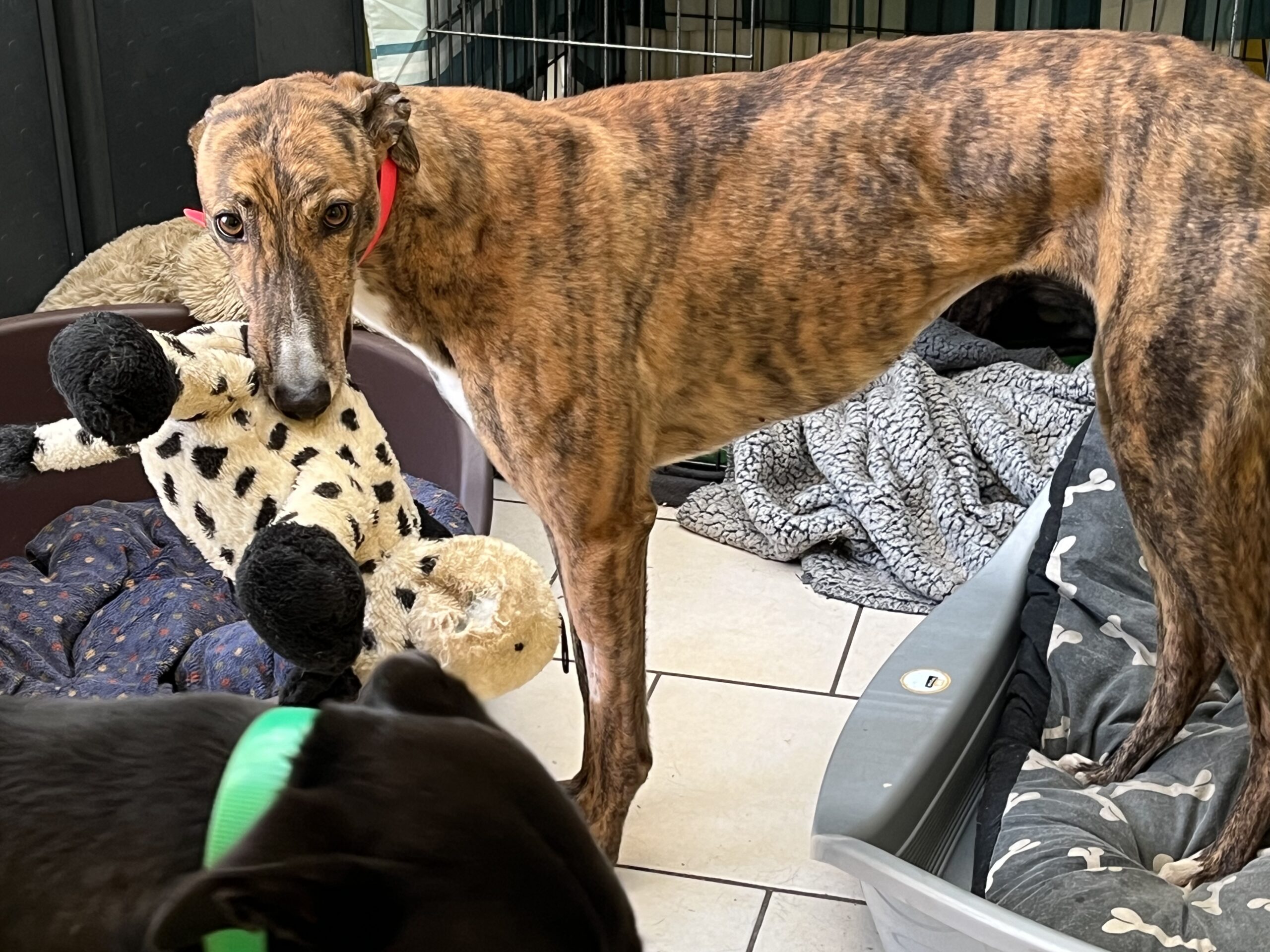 Our gorgeous girl lives alongside 7 other greyhounds both girls and boys, she gets on well with them all. Kolby isn’t a big fan of thunder and fireworks but she will just curl up alongside one of her friends. She doesn’t show a huge amount of stress as long as she has the comfort of her friends or you to sit near.