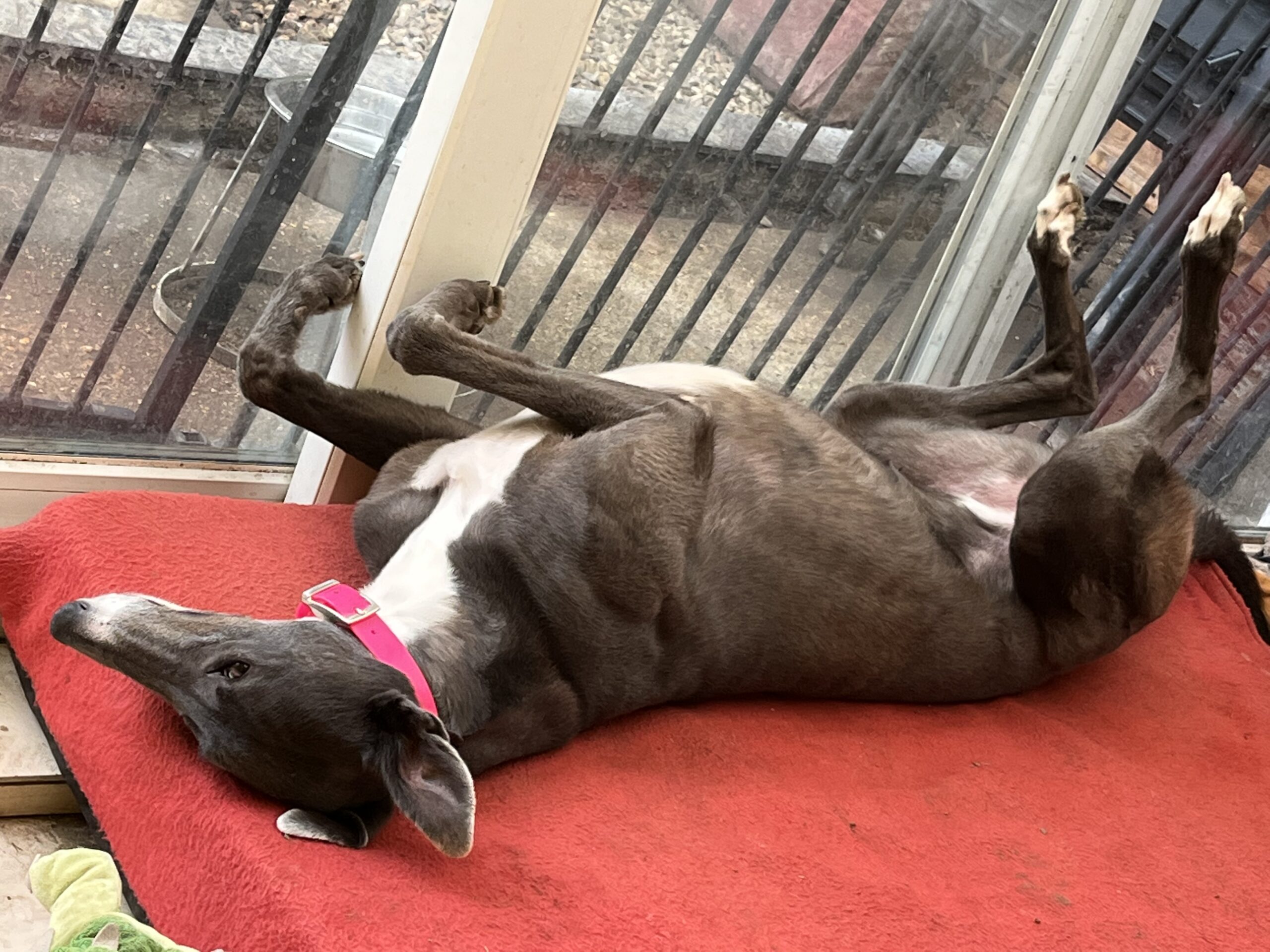 During her stay in the home environment she has learnt to be house trained, to not jump up at cupboards; even when there are yummy food items on the side! She is quiet when left with her other dog friendss, enjoys company from the other dogs and can share beds with them. Zaza isn’t fazed by strange noises made by the radio, dishwasher or fridge. She can sometimes be a little jumpy if there is a loud bang (from the docks) outside but will find her human friends for reassurance and then be ok again.