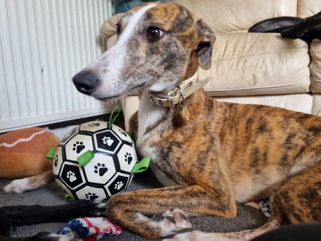 Our gorgeous girl lives alongside 7 other greyhounds both girls and boys, she gets on well with them all.