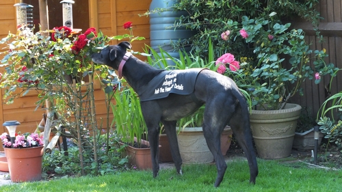 Some more time spent at Dodger’s forever home where I explored the garden and chased up and down the lawn as if I was still on a racetrack, I love to run you know. Dodger chose not to join me, obviously he knew that I would’ve shown him who is the fastest dog! I also spotted that rose bush that I cut my ear on last time I was here. I’ll keep away from that one then, once bitten twice shy you know.